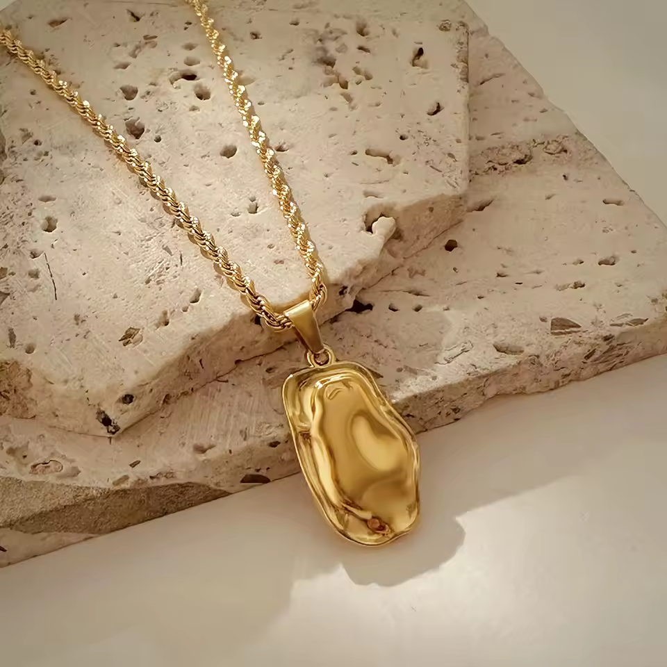 Design Vintage Glossy Gold Hammered Irregular Pendant:Featuring a unique, hammered gold pendant, this piece exudes vintage charm and elegance.